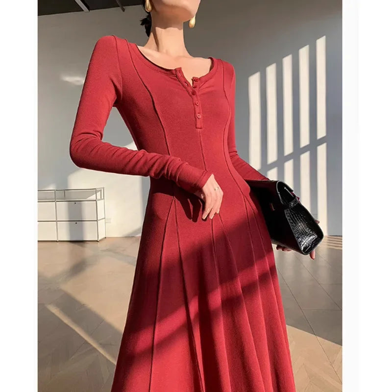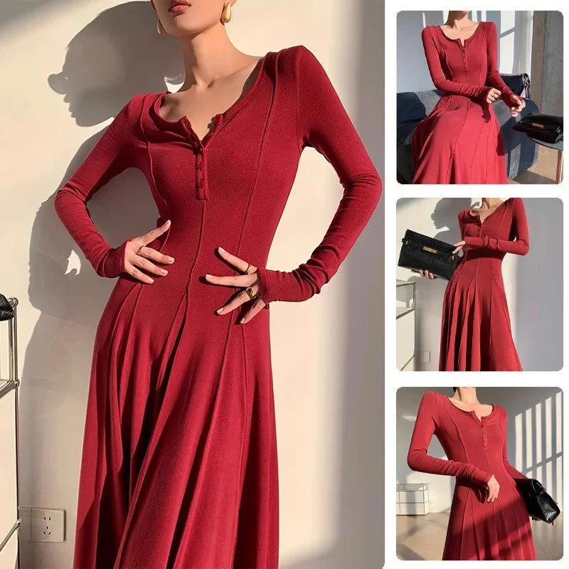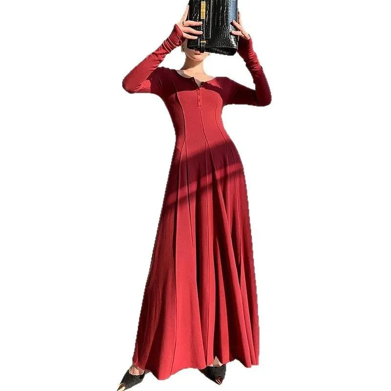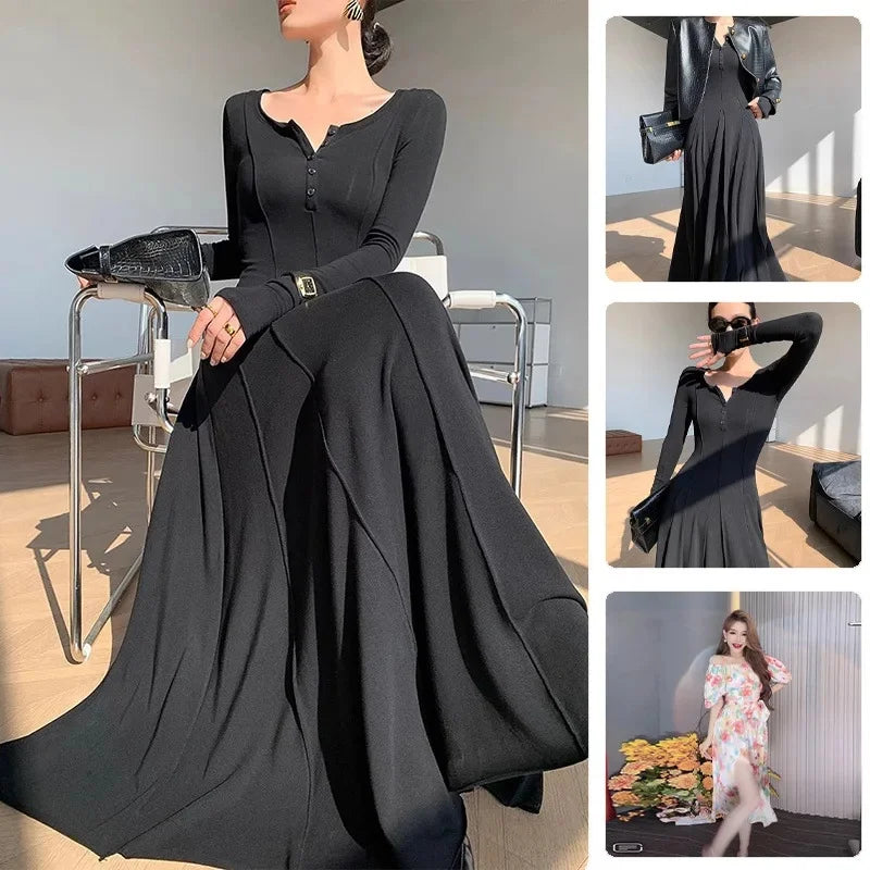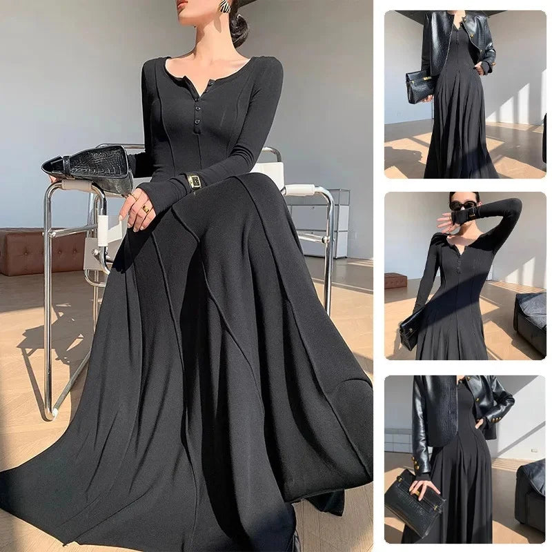 Black Fashion Long Sleeve Knitted Dress Women's Slim Fit Maxi Skirt Autumn New Style Elegant Draped Gown Full Length Dress
