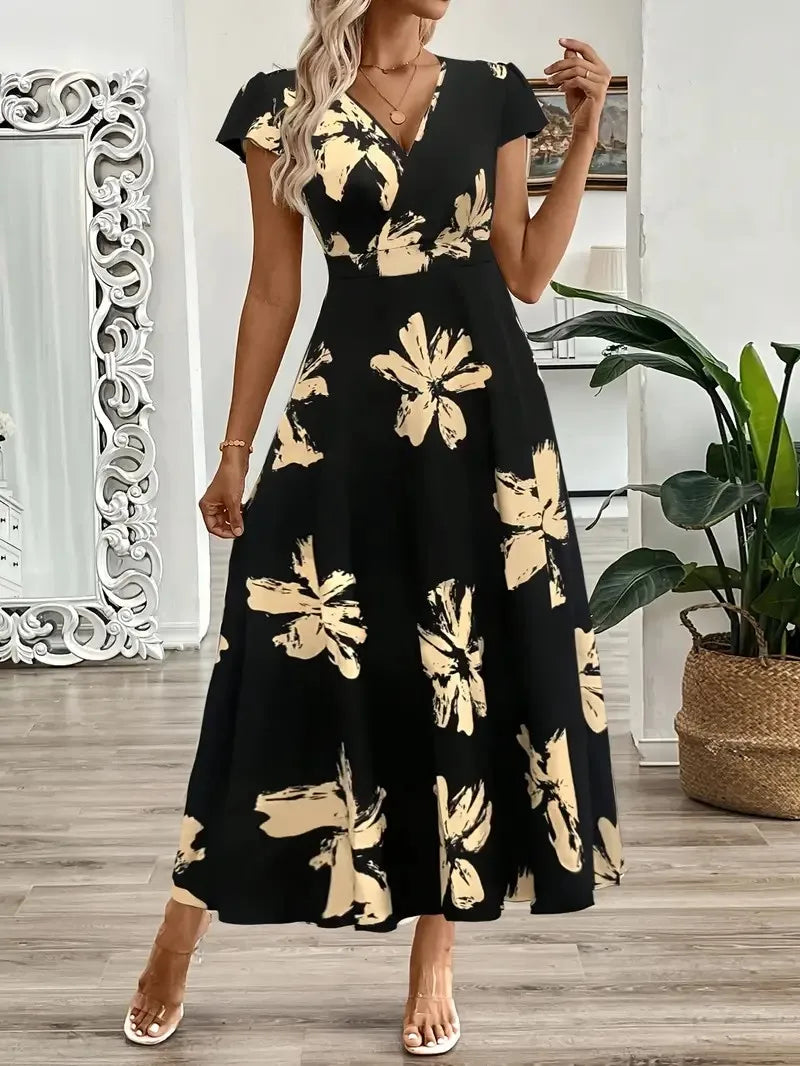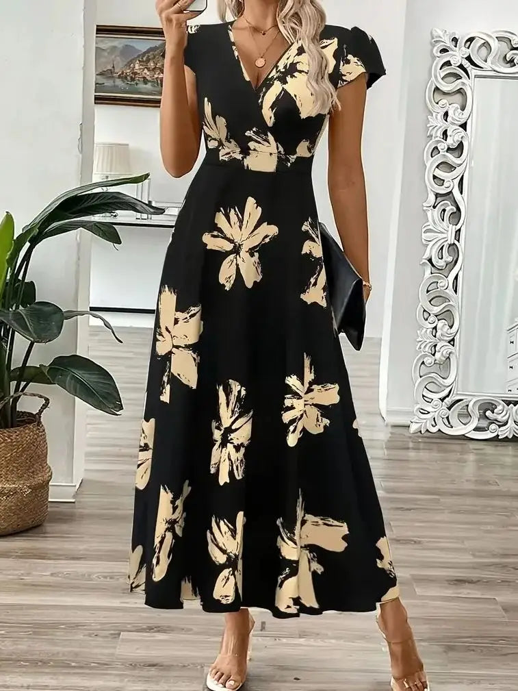 Fashionable Women's Black and Gold Floral Maxi Dress with V-Neck, Short Flared Sleeves, and Wrap Waist for an Elegant Casual Loo