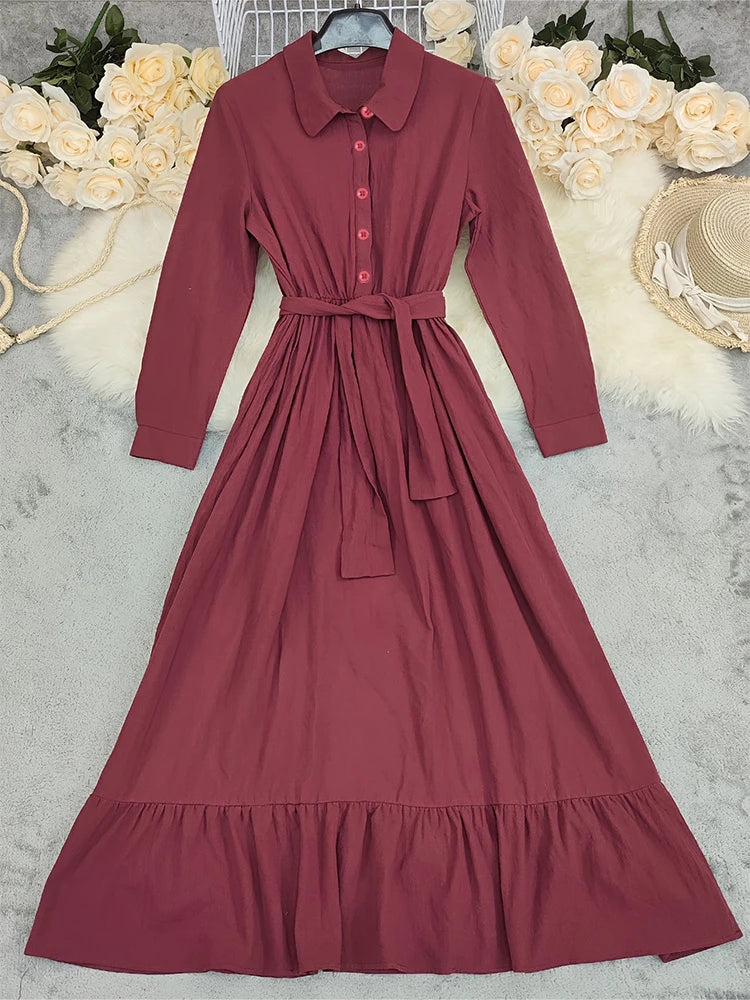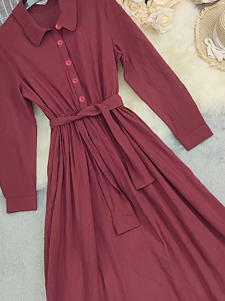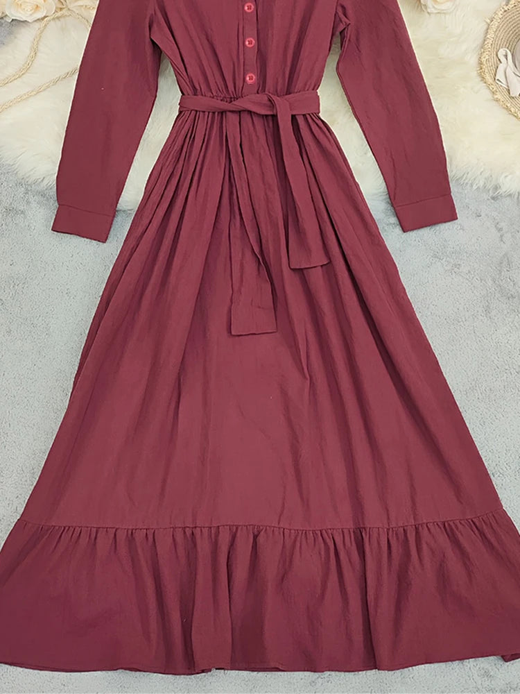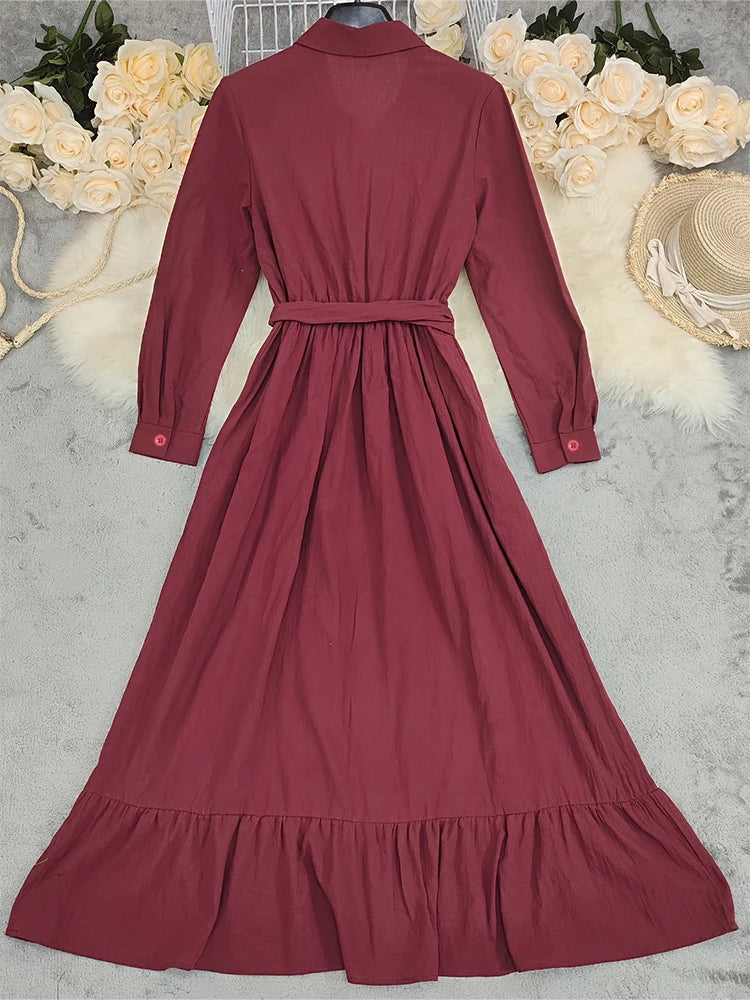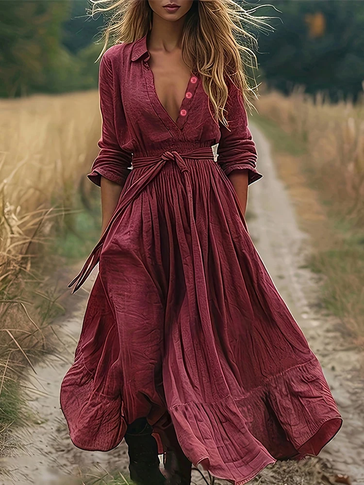 Fashionable women's burgundy deep V-neck long dress with a drawstring waist, textured fabric, vintage Bohemian casual style