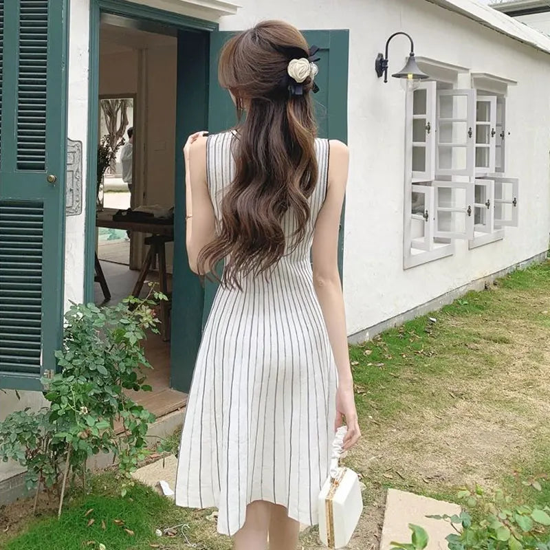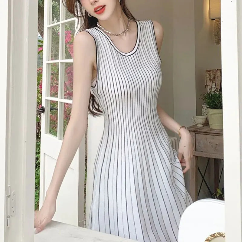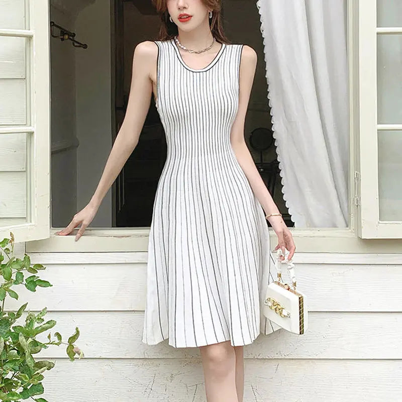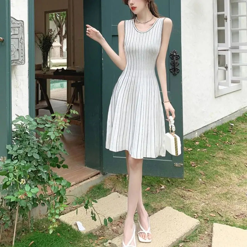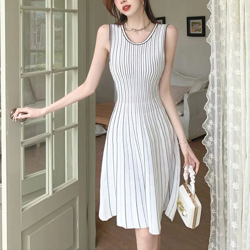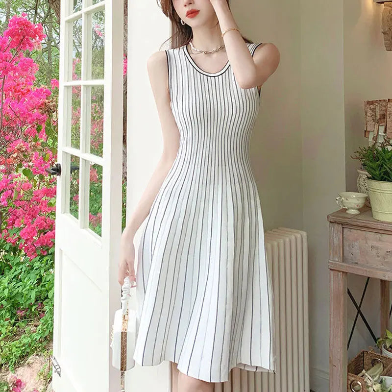 French Style Striped Midi Dress Female Clothing Sleeveless Summer Gentle A-Line Waist Basic Round Neck Elegant Knitted Dresses