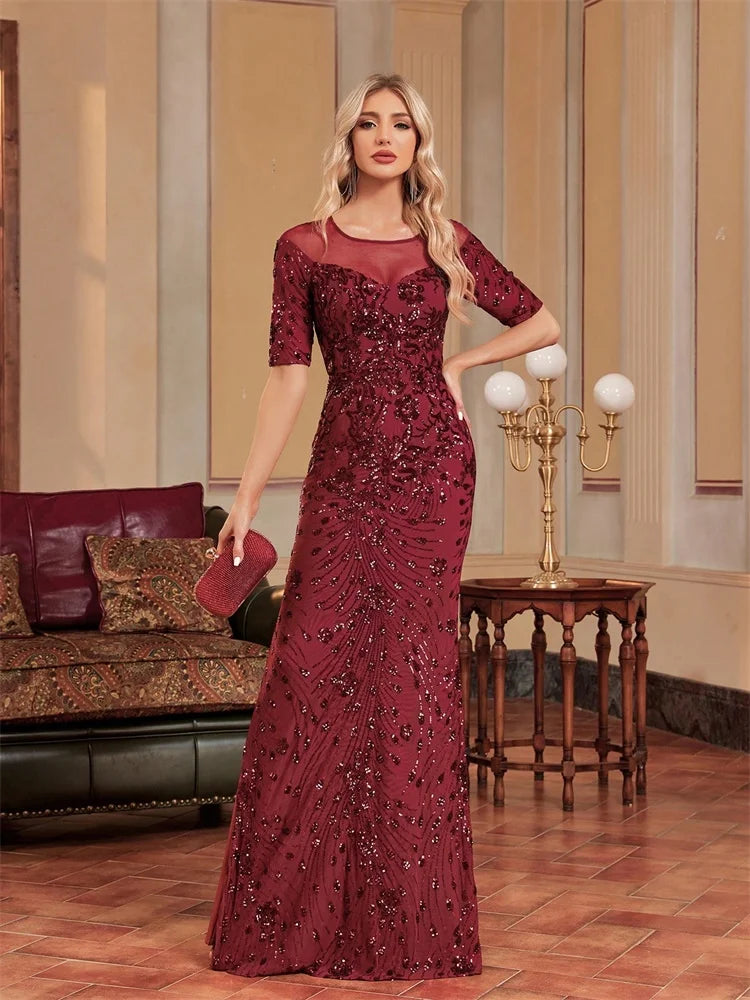 Luxury O-Neck Tulle Sequin Formal Evening Dress Women Short sleeve Wedding Party Prom Maxi Cocktail Mermaid Bridesmaid Gowns