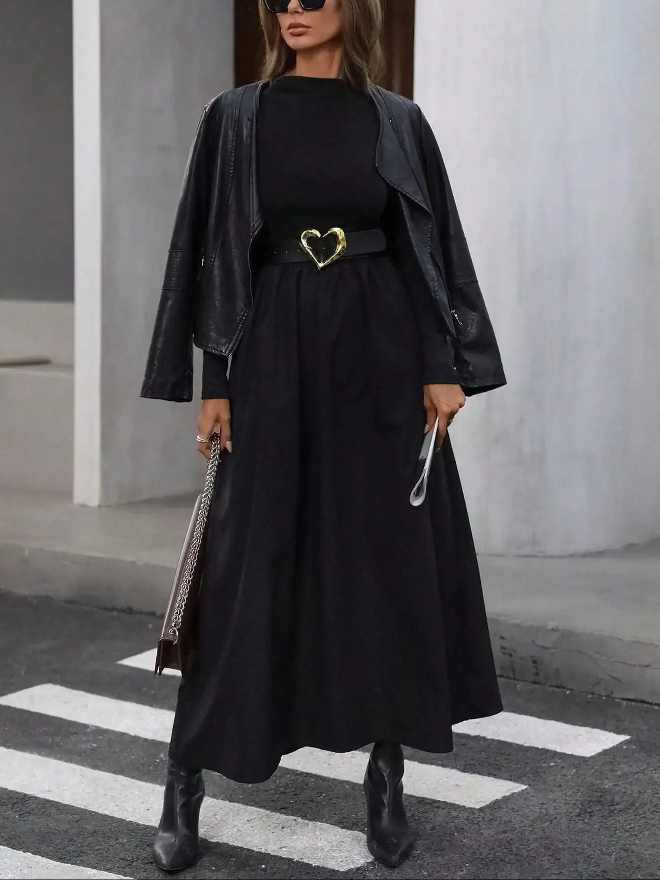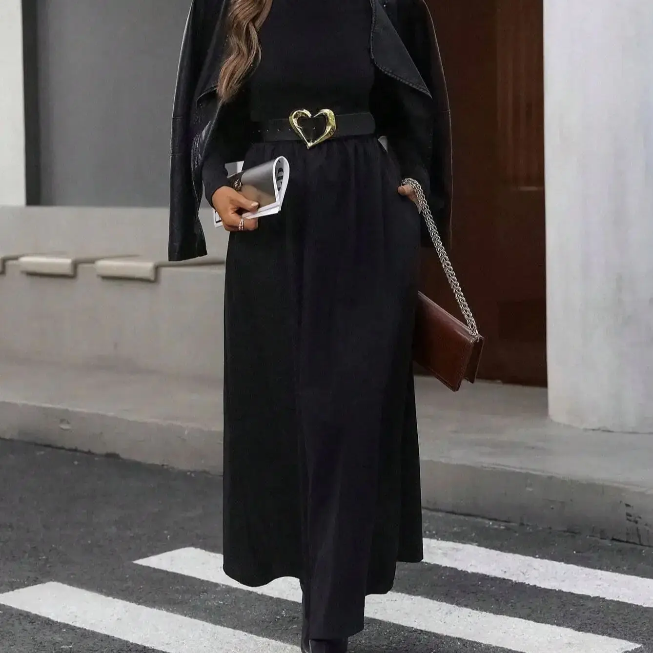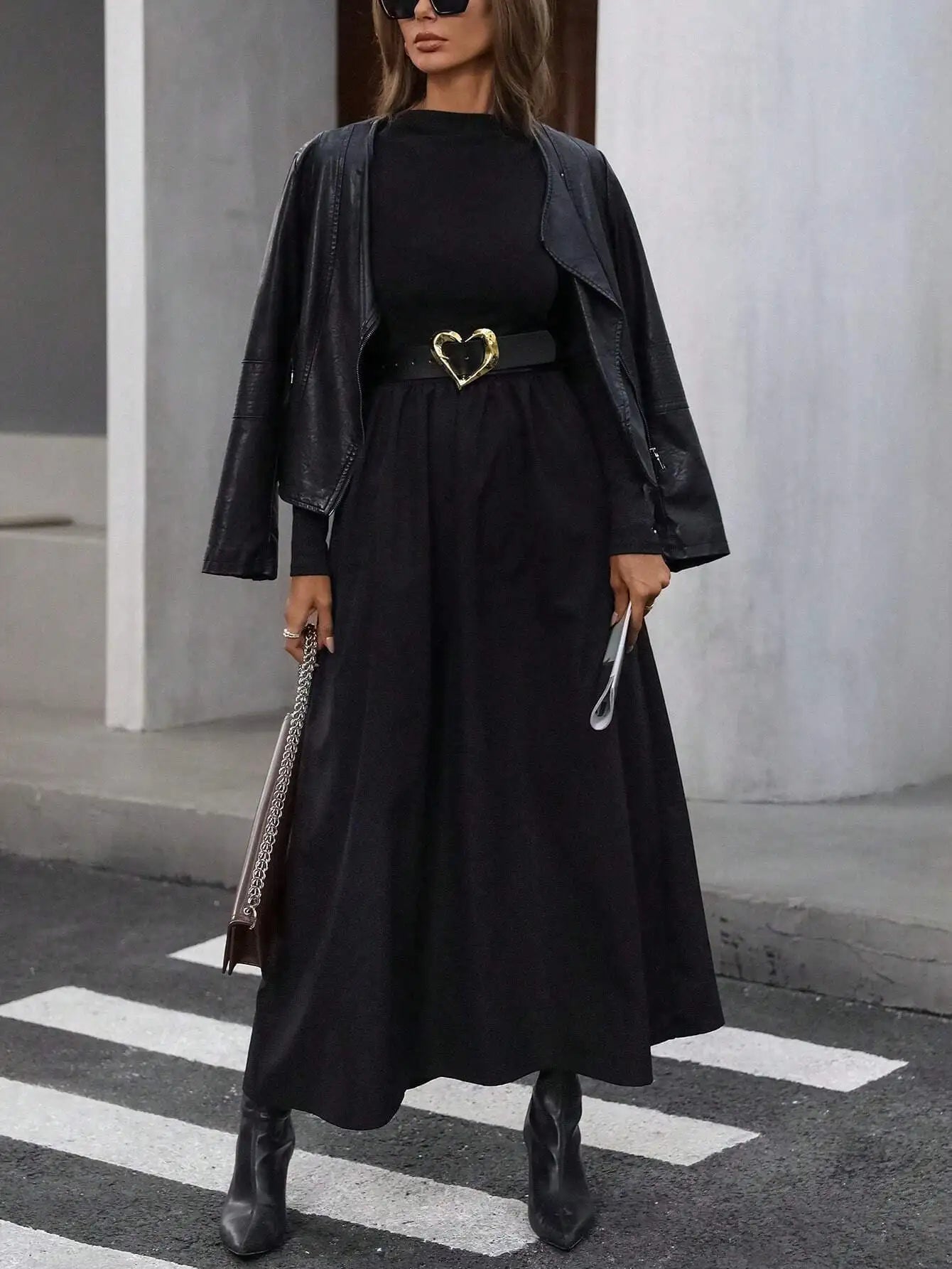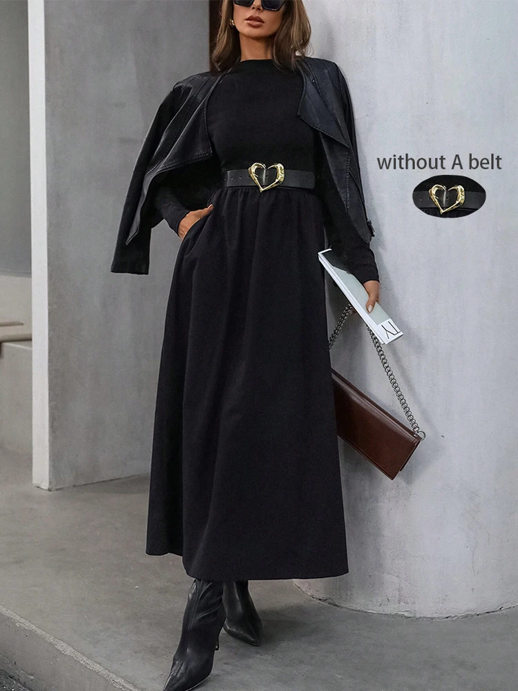 Women's Black Mock Neck Long Sleeve Maxi Dress High Waisted Flowy Skirt Slim Fit Elegant Casual Daily Office Date Wear